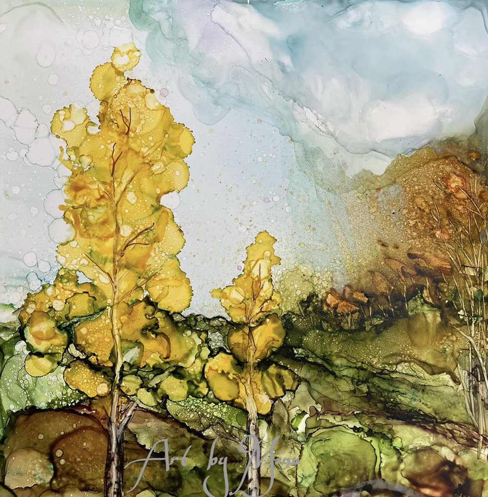 Minu Achrekar was born in India and settled in Leeds for more than 20 years. Minu is inspired both by the beautiful countryside in Yorkshire  and the colours and patterns of her travels abroad. She typically uses alcohol inks as they are vibrant, and unpredictable working on a variety of substrates, and without brushes instead moving the inks patiently with tilting methods or hairdryers and straws.