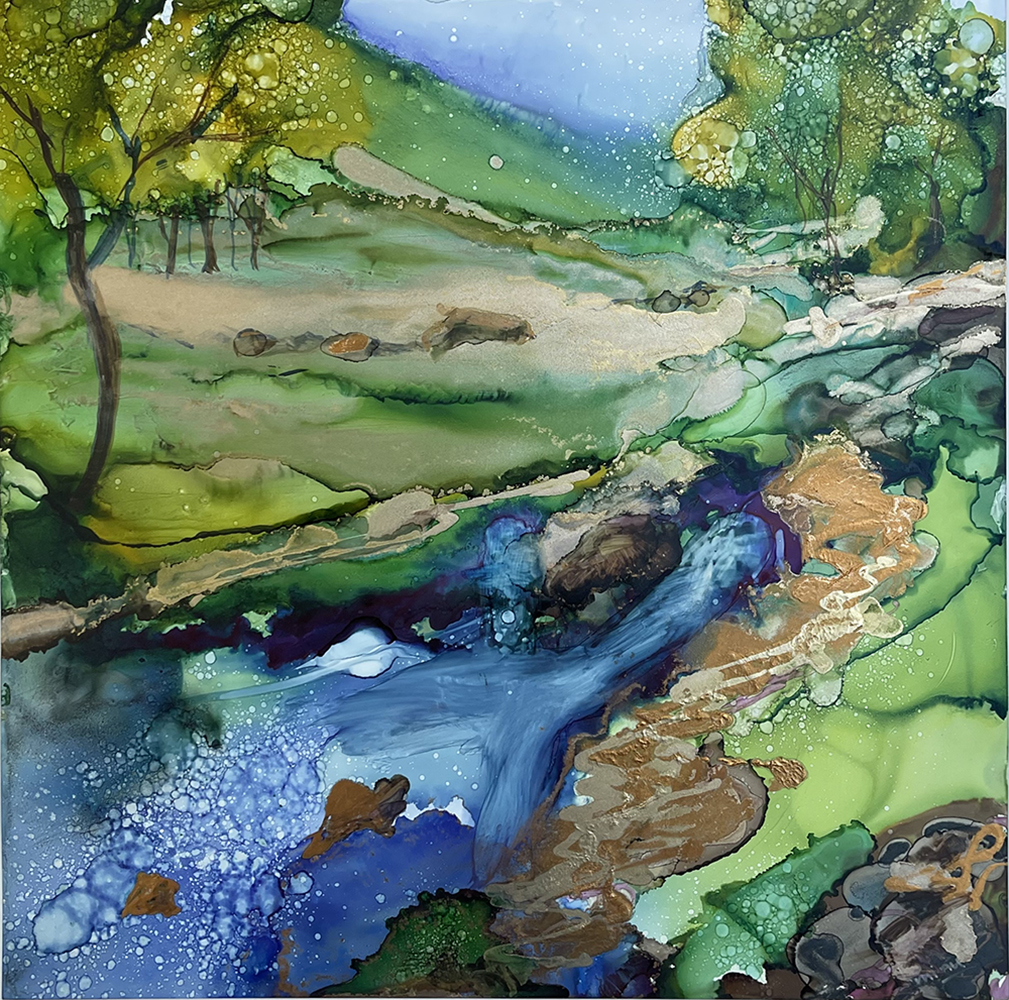 Minu Achrekar was born in India and settled in Leeds for more than 20 years. Minu is inspired both by the beautiful countryside in Yorkshire and the colours and patterns of her travels abroad. She typically uses alcohol inks as they are vibrant, and unpredictable working on a variety of substrates, and without brushes instead moving the inks patiently with tilting methods or hairdryers and straws.