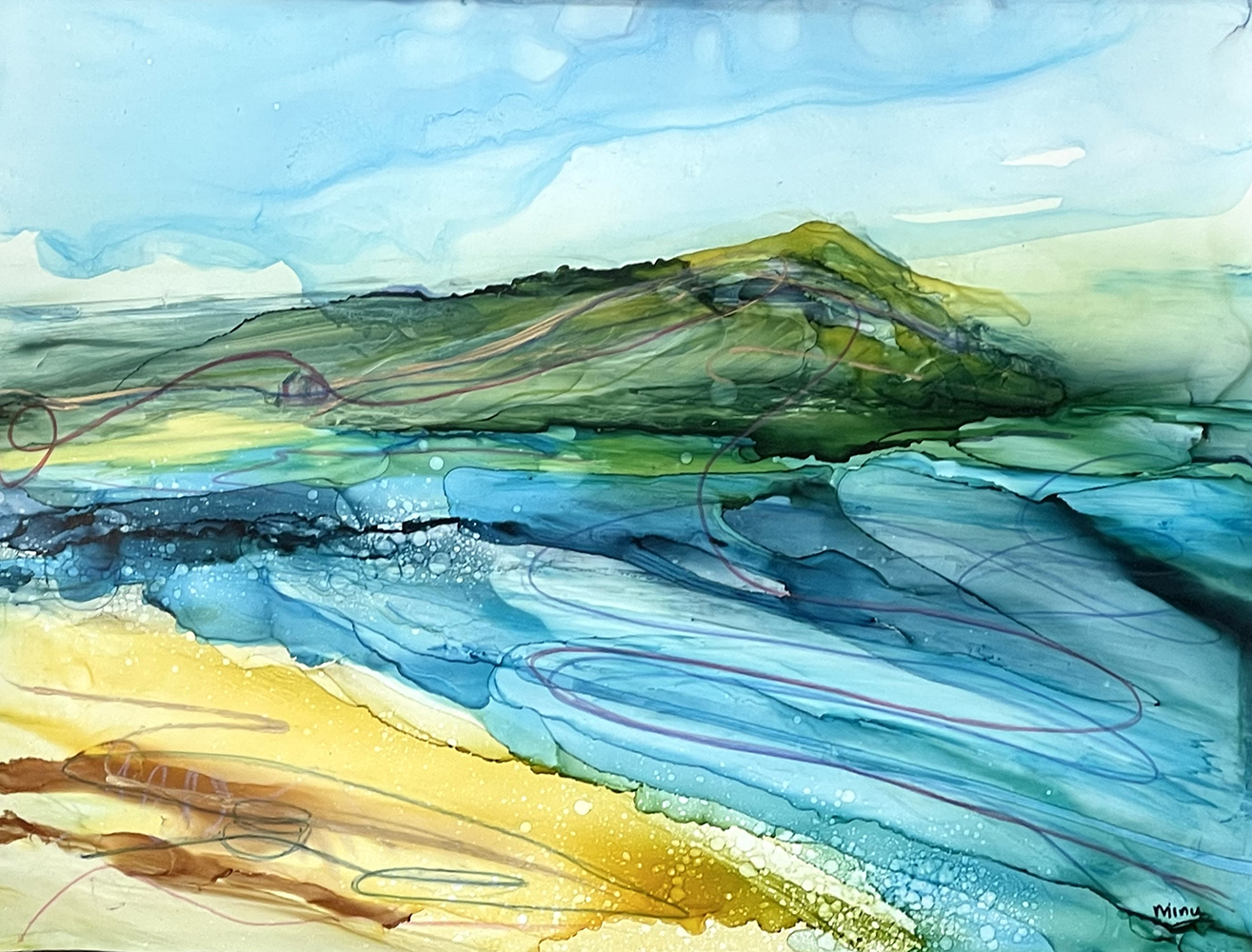 Minu Achrekar was born in India and settled in Leeds for more than 20 years. Minu is inspired both by the beautiful countryside in Yorkshire and the colours and patterns of her travels abroad. She typically uses alcohol inks as they are vibrant, and unpredictable working on a variety of substrates, and without brushes instead moving the inks patiently with tilting methods or hairdryers and straws.