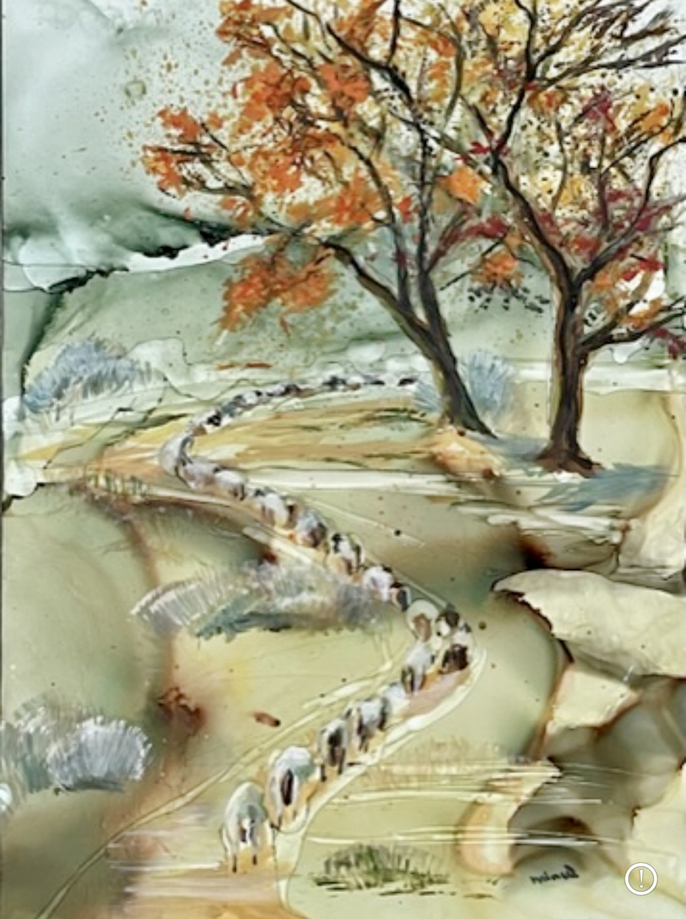 Minu Achrekar was born in India and settled in Leeds for more than 20 years. Minu is inspired both by the beautiful countryside in Yorkshire and the colours and patterns of her travels abroad. She typically uses alcohol inks as they are vibrant, and unpredictable working on a variety of substrates, and without brushes instead moving the inks patiently with tilting methods or hairdryers and straws.