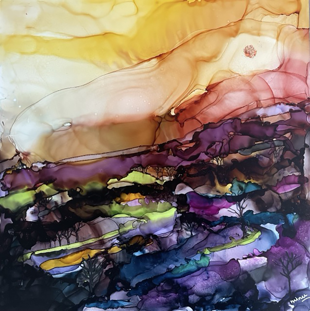 Minu Achrekar was born in India and settled in Leeds for more than 20 years. Minu is inspired both by the beautiful countryside in Yorkshire  and the colours and patterns of her travels abroad. She typically uses alcohol inks as they are vibrant, and unpredictable working on a variety of substrates, and without brushes instead moving the inks patiently with tilting methods or hairdryers and straws.